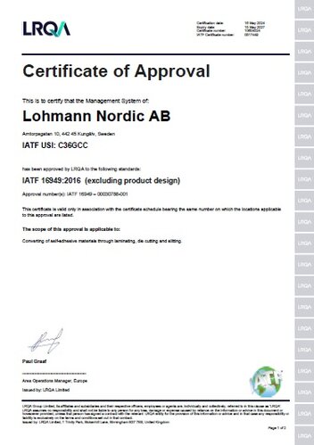 Lohmann Nordic is certified in the areas of Quality (ISO 9001), Environment (ISO 14001) and Automotive (IATF 16949):